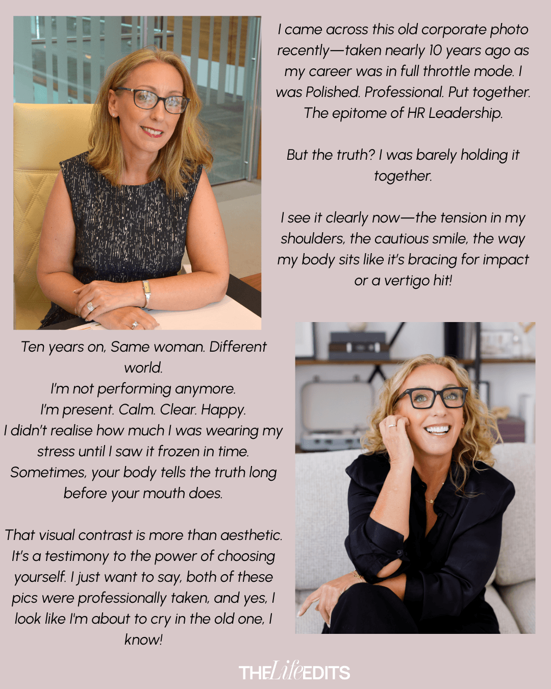 I see it clearly now, the tension in my shoulders, the cautious smile, the way my body sits like it’s bracing for impact or a vertigo hit!
